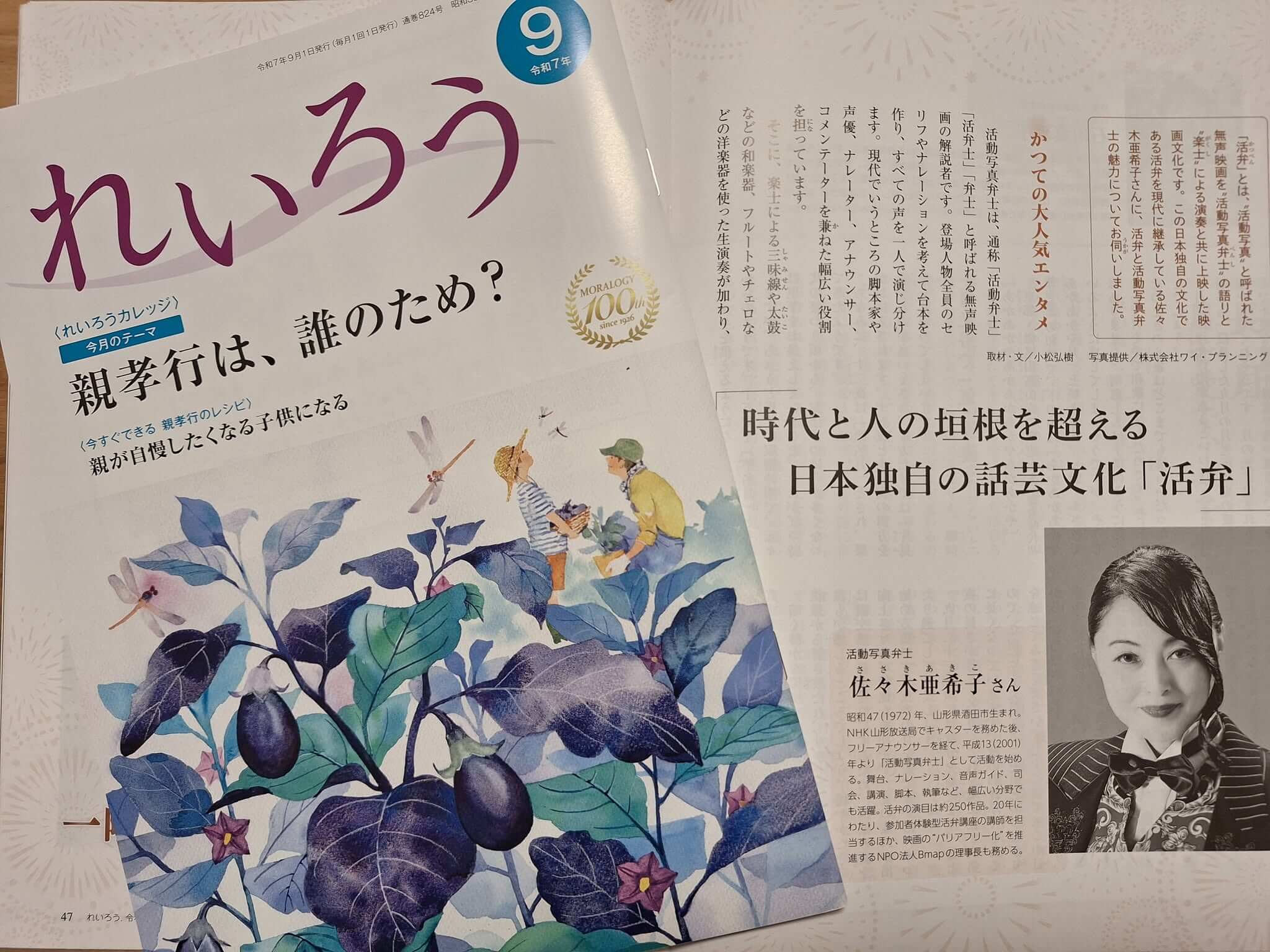 このたび、雑誌『れいろう』令和7年9月号「一隅を照らす」において“時代と人の垣根を超える 日本独自の話芸文化「活弁」”を執筆いたしました。
