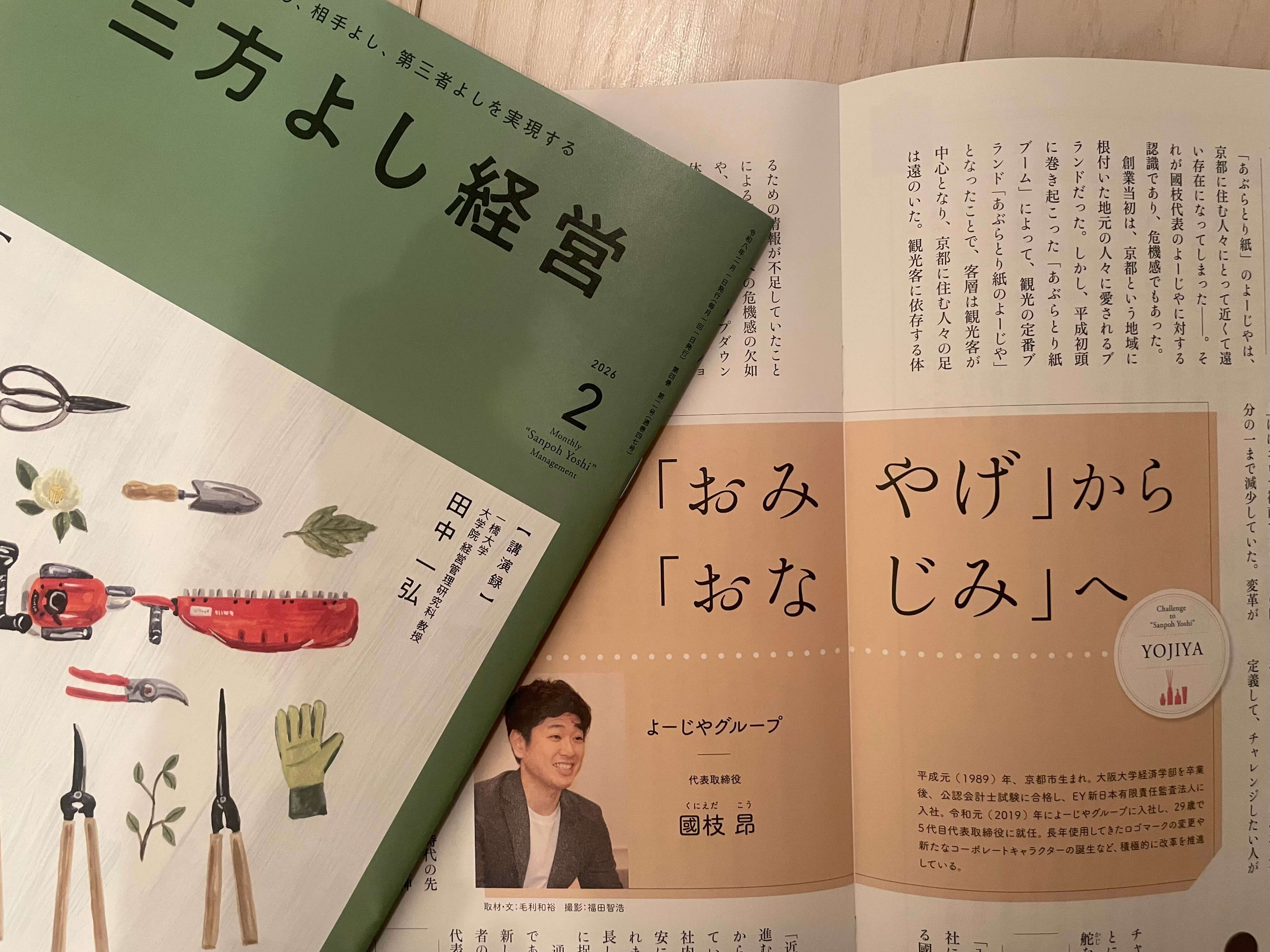 このたび『月刊三方よし経営』令和8年2月号の連載企画「三方よしへの挑戦」にて、あぶらとり紙で有名なよーじやグループの國枝昂代表にお話を伺い、インタビュー記事を執筆いたしました。