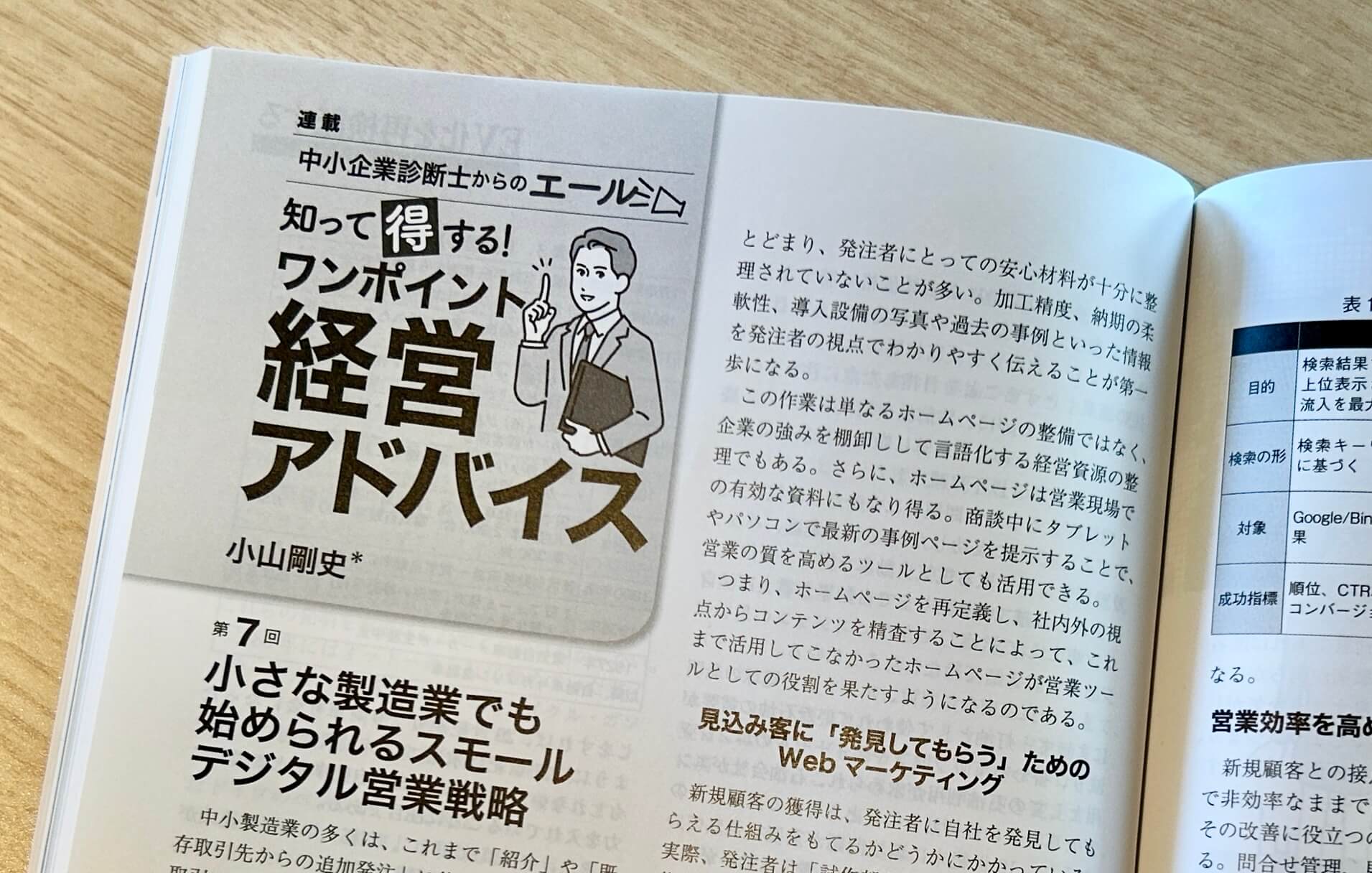 今回は「小さな製造業でも始められるスモールデジタル営業戦略」について執筆しております。紹介での受注が中心となっているような小さな製造業でも、Web経由での受注チャネルを構築する足がかりになればと思い執筆させていただきました。